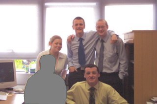 | And while we're talking about work, here's a picture of my crew. They are (from left to right in the back) Tara (support person for the group, age 20), Alan (credit controller, age 19), Alex (ex-senior credit controller, just turned 26 and resigned a couple of weeks ago), and Peter in front (credit controller age 34). We have just hired someone to fill Alex's void and she will start in early June. I'll update the picture later and include Sharon (my boss). She was originally in this group shot but it wasn't a very good picture of her. (I've had Tom cut her out of the picture because just yesterday she said she was going to check out the website and I'd like to keep my job;-) Life at work has been one big soap opera (really!) for the past month or so but things are settling down now. I think it would make a good sitcom once it is all sorted out. Never a dull moment though, I will say that! Too complicated to really write about. We'll talk. | ![]() |